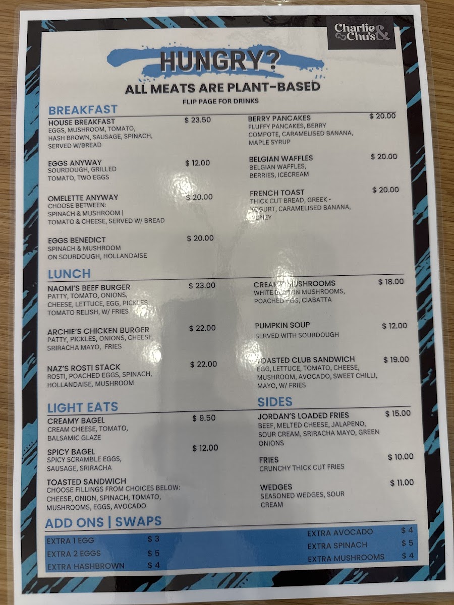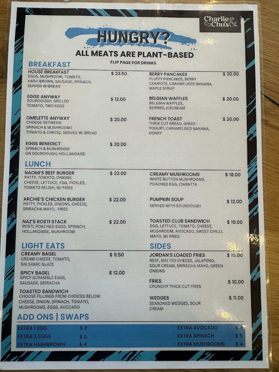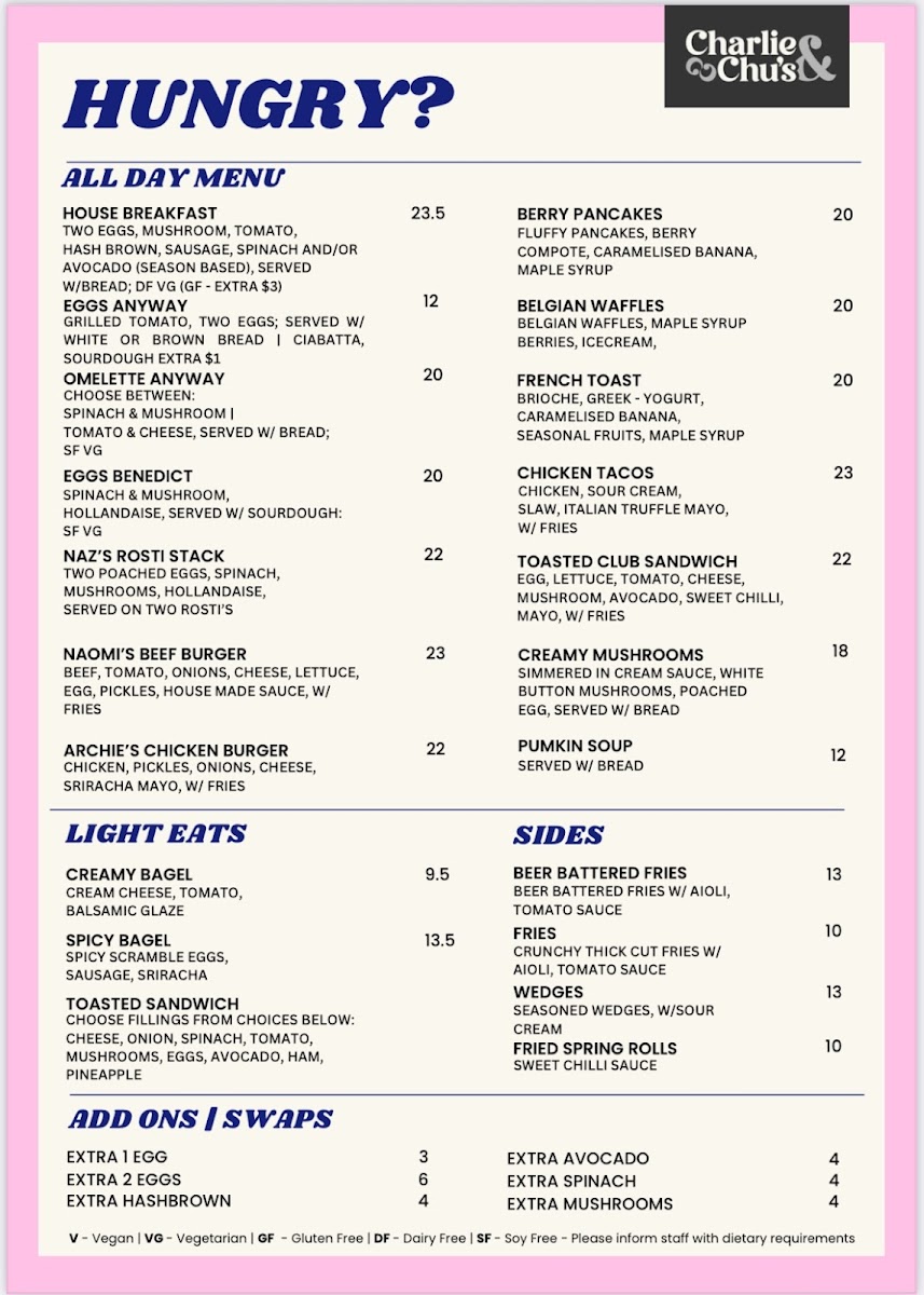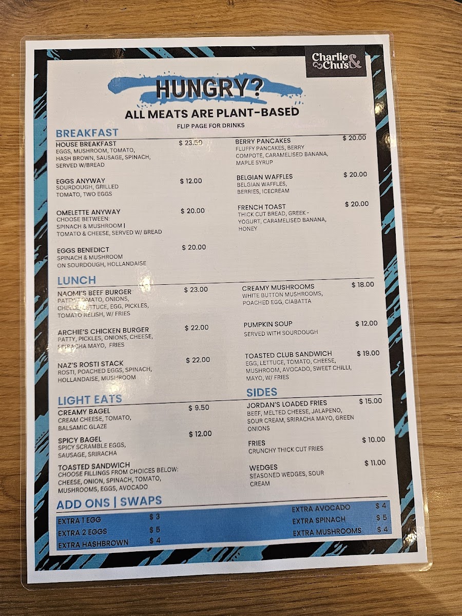 The menu at Charlie & Chu’s Cafe offers a variety of options suitable for breakfast, light meals, and coffee breaks. It features an all-day menu with classic breakfast items such as House Breakfast, Eggs Benedict, French Toast, and Belgian Waffles. Sandwiches and burgers are available, including the Toasted Club Sandwich and Naomi's Beef Burger, alongside lighter fare like Pumpkin Soup.