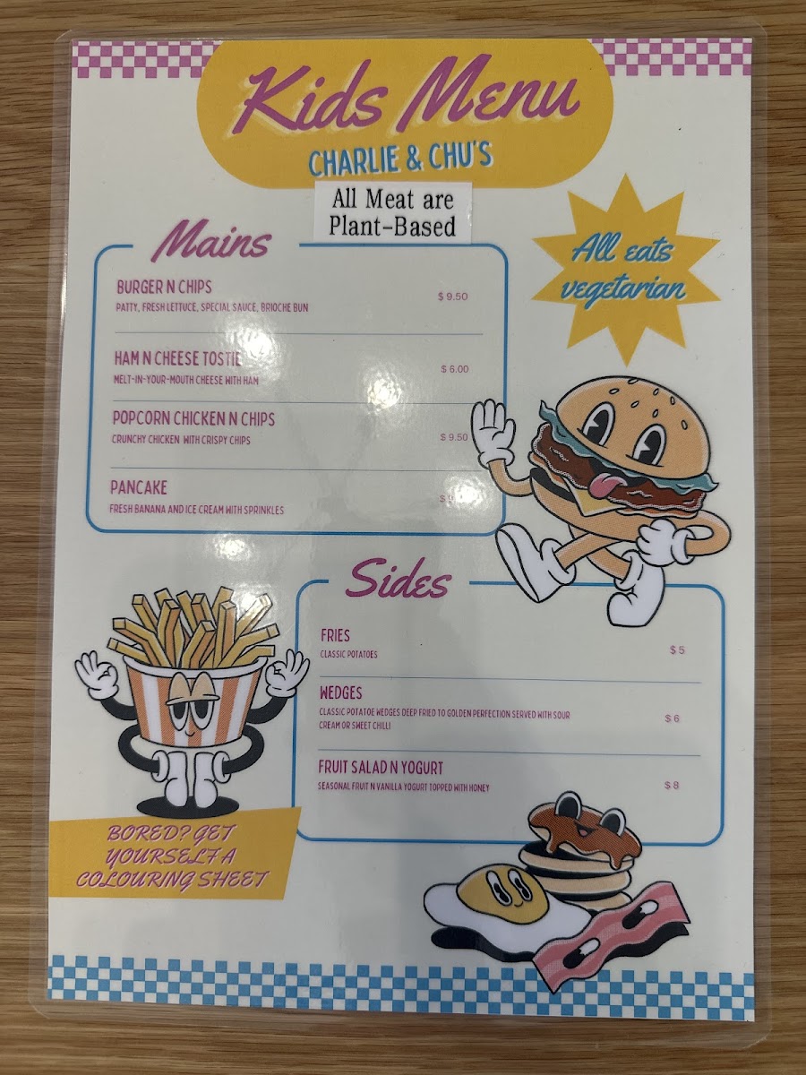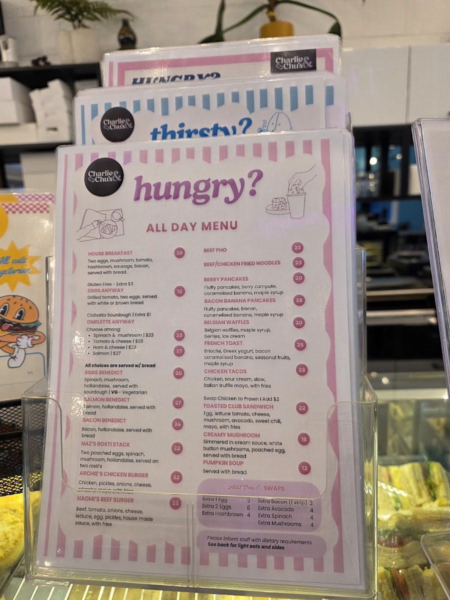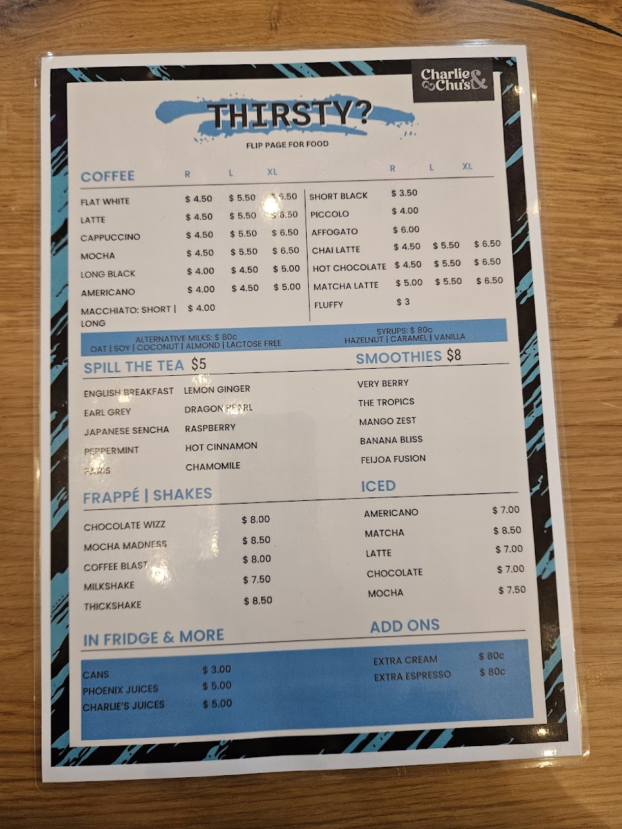 The menu at Charlie & Chu’s Cafe offers a variety of options suitable for breakfast, light meals, and coffee breaks. It features an all-day menu with classic breakfast items such as House Breakfast, Eggs Benedict, French Toast, and Belgian Waffles. Sandwiches and burgers are available, including the Toasted Club Sandwich and Naomi's Beef Burger, alongside lighter fare like Pumpkin Soup.