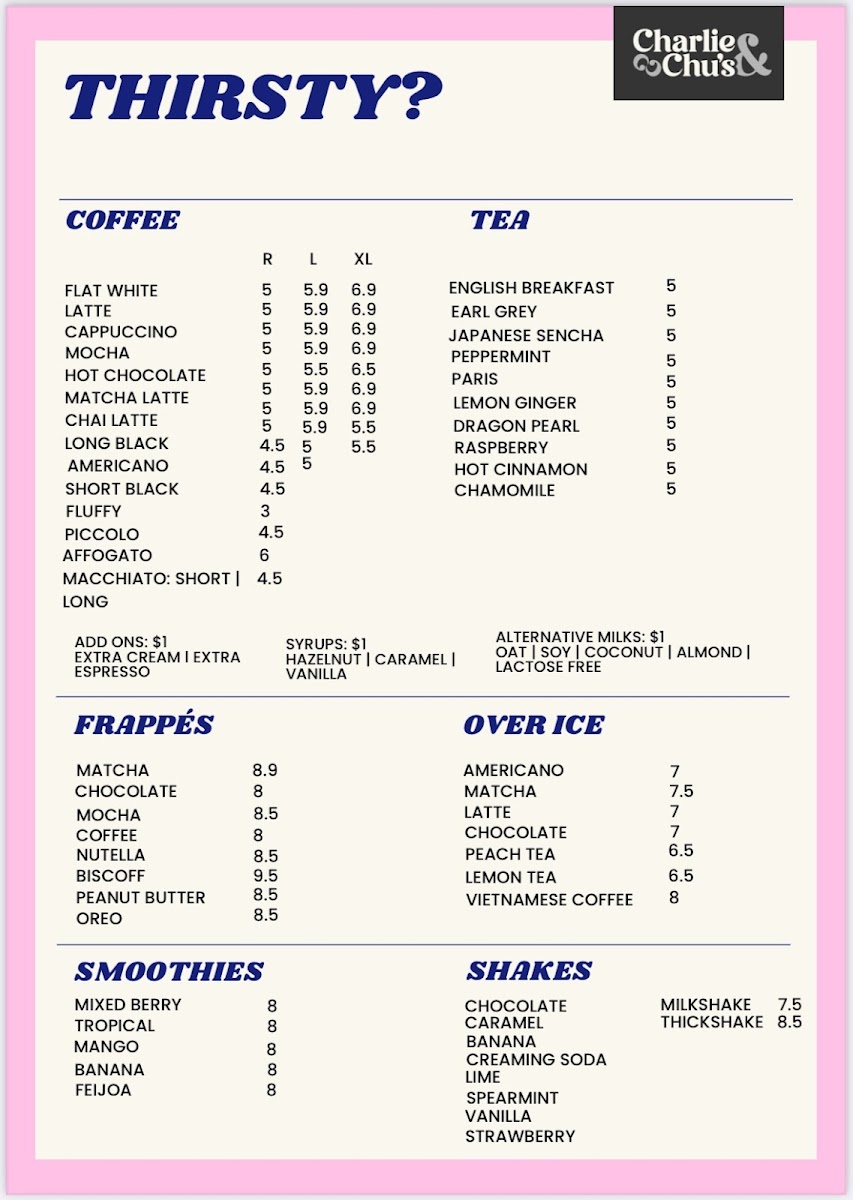 The coffee selection includes a range of espresso-based drinks such as Flat White, Latte, Cappuccino, Mocha, and Americano, as well as specialty options like Chai Latte, Matcha Latte, and Affogato. Cold beverages include iced versions of Americano, Latte, Matcha, Mocha, and Chocolate.